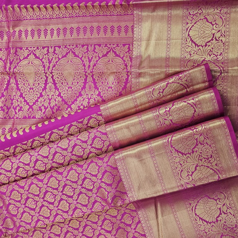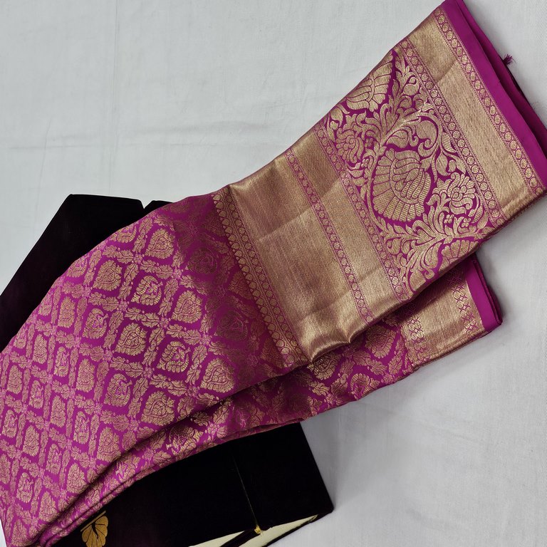 This pure silk saree pairs elegantly with traditional gold jewellery for a regal look or with sleek, minimalist accessories for a contemporary, refined ensemble.