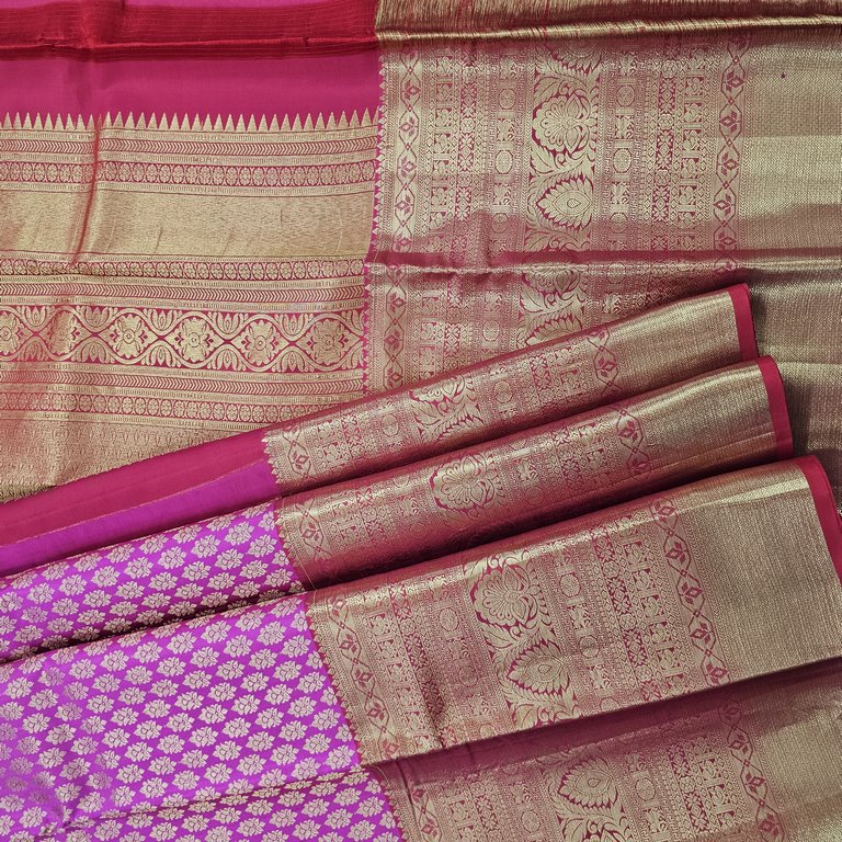 This pure silk saree pairs elegantly with traditional gold jewellery for a regal look or with sleek, minimalist accessories for a contemporary, refined ensemble.