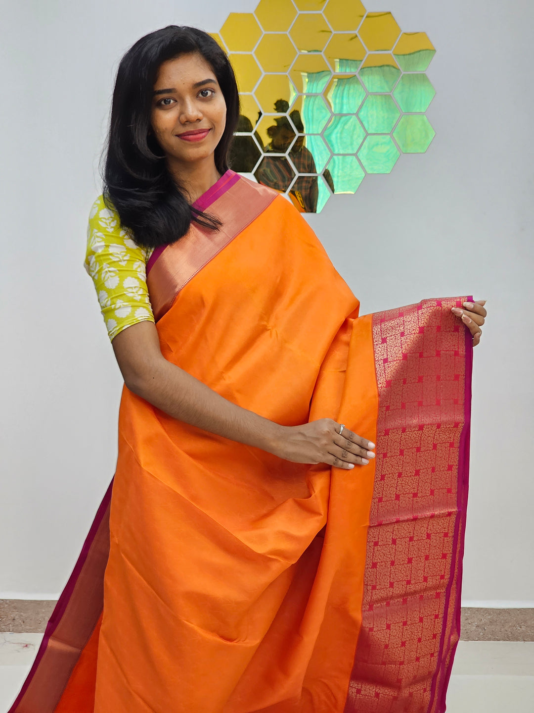 This Semi-silk saree pairs beautifully with traditional gold jewelry or minimalist accessories for a more modern look