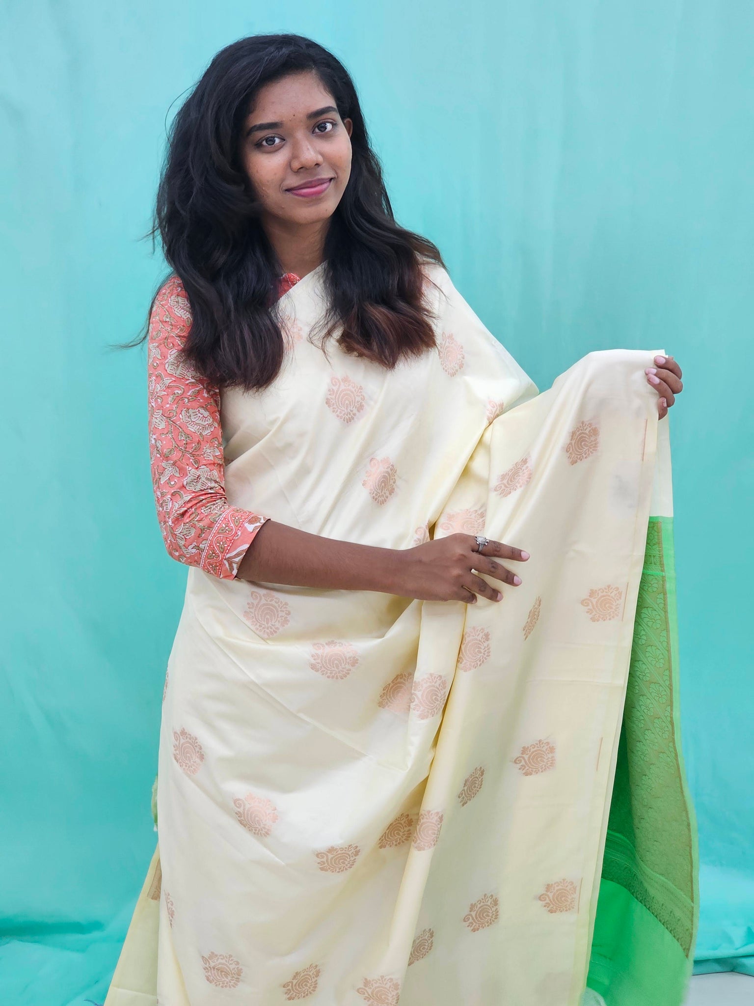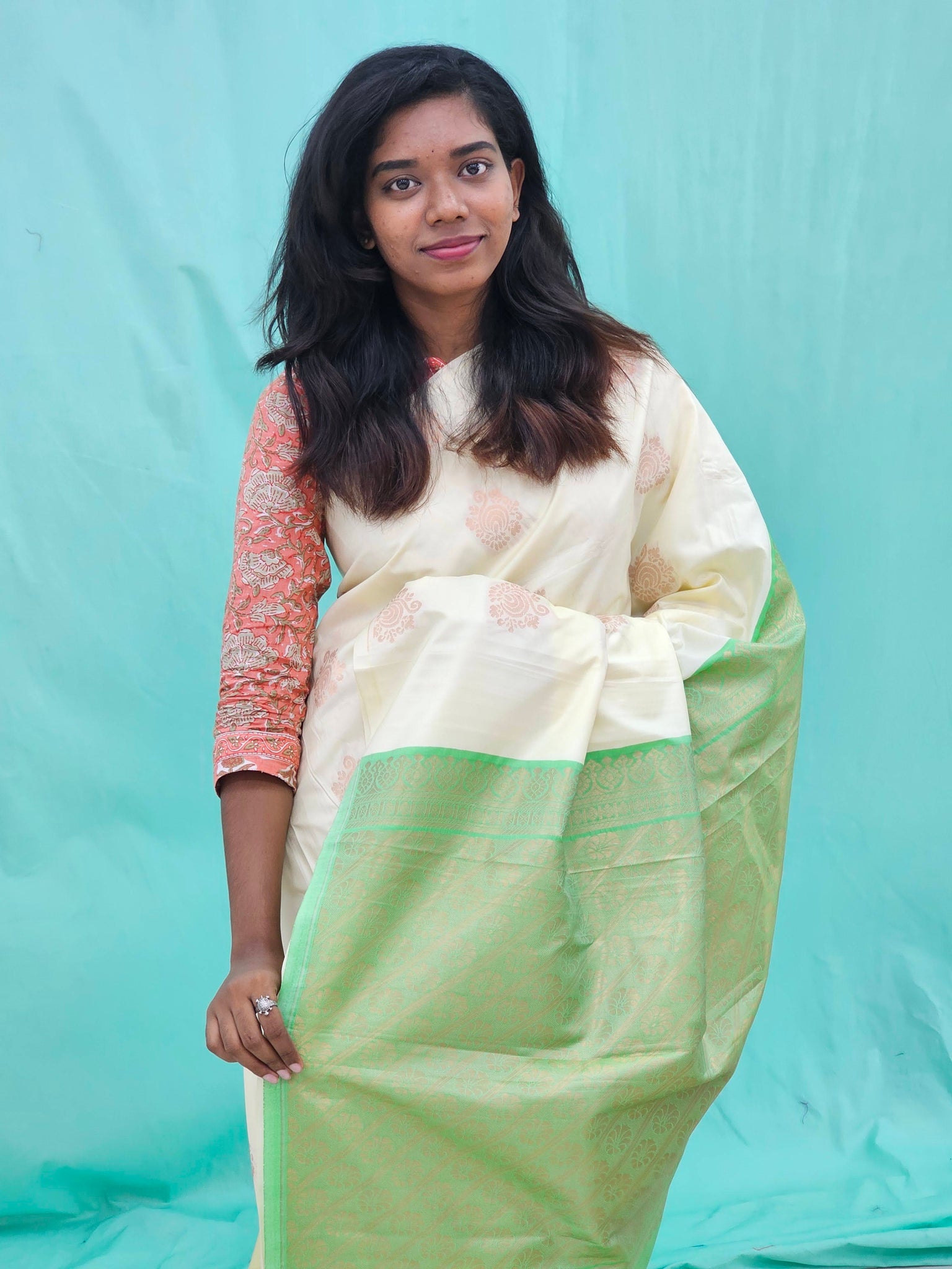 This Semi-silk saree pairs beautifully with traditional gold jewelry or minimalist accessories for a more modern look