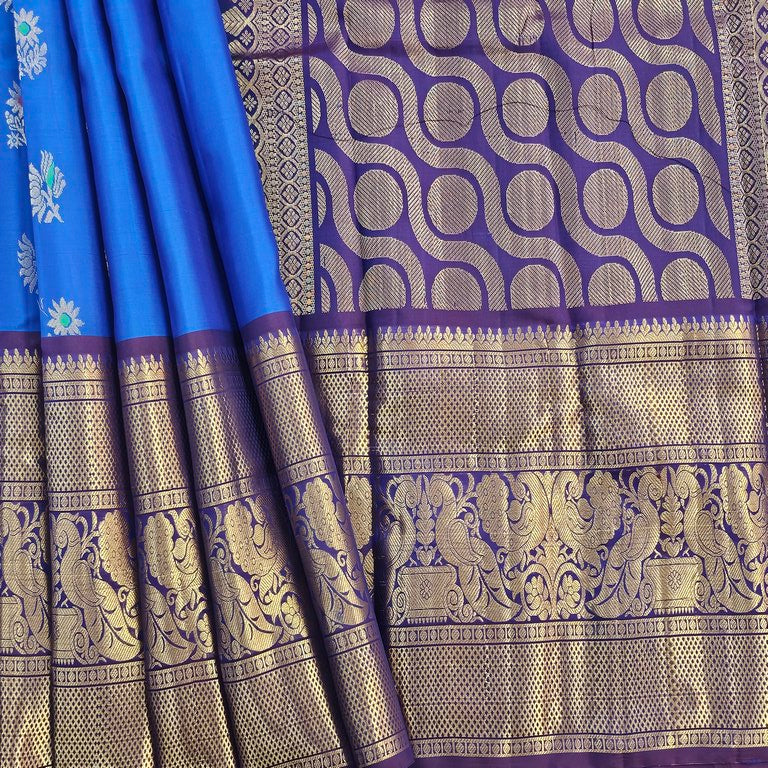 Pallu: Rich purple pallu with bold gold zari abstract, peacock & traditional motifs
